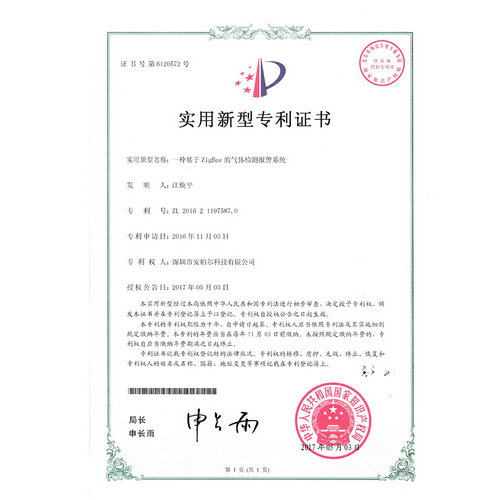 一种基于ZigBee的气体检测报警系统专利证书
