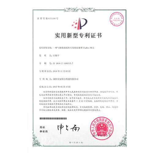 一种气体监测系统专用的防爆型ZigBee网关专利证书