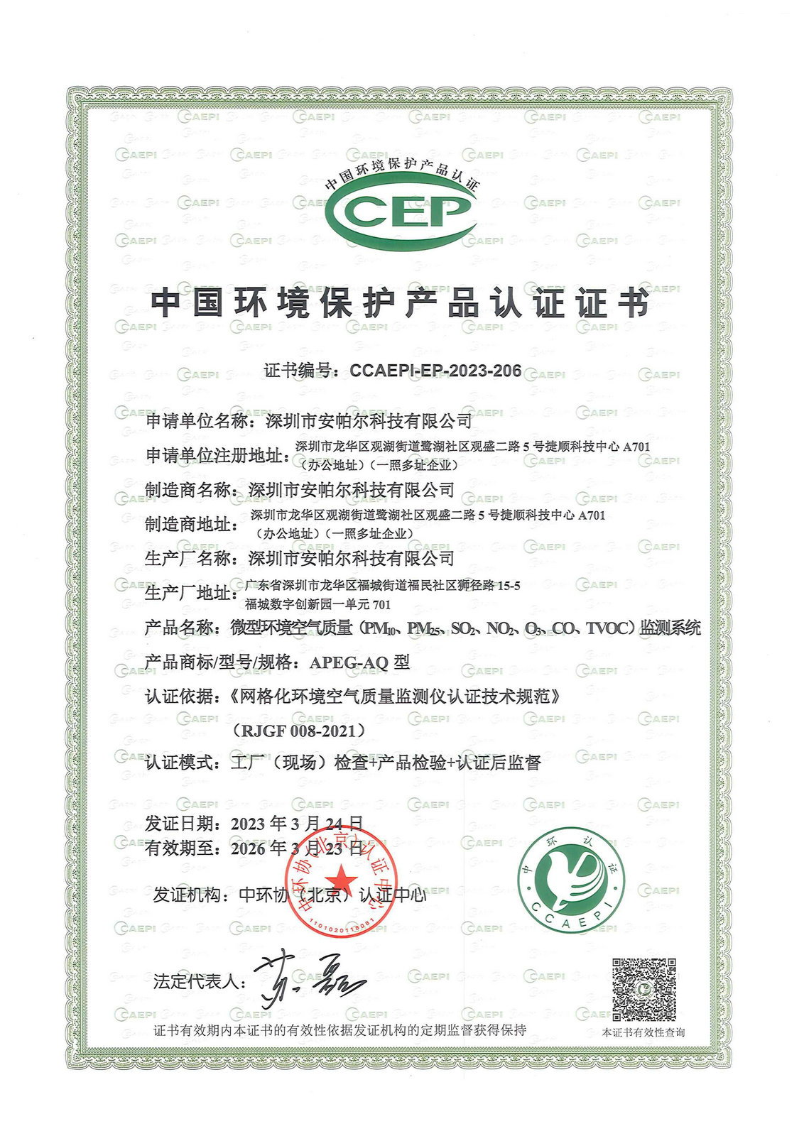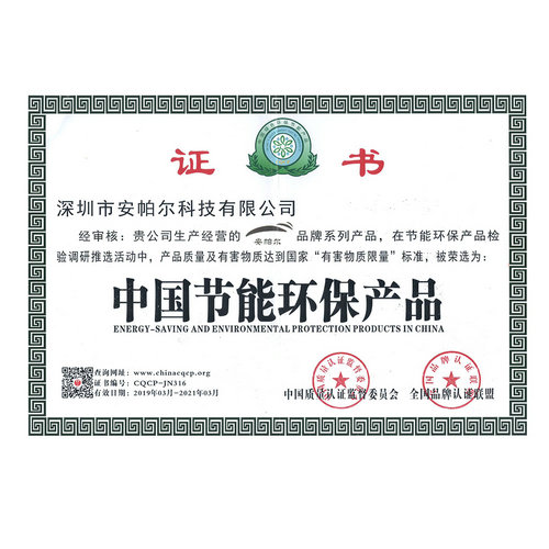 中国环境保护产品认证证书 APEG-AQ