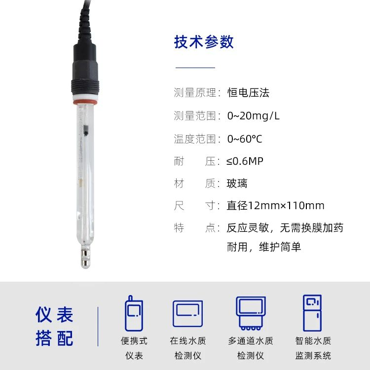 电极上的隔膜会选择性的让待测溶液中的HOCl穿透并扩散在阴极表面,在阴极和阳极之间外加一定的极化电压会使得HOCl在阴极上被还原,这些化学反应会产生和余氯浓度成正比的电流。