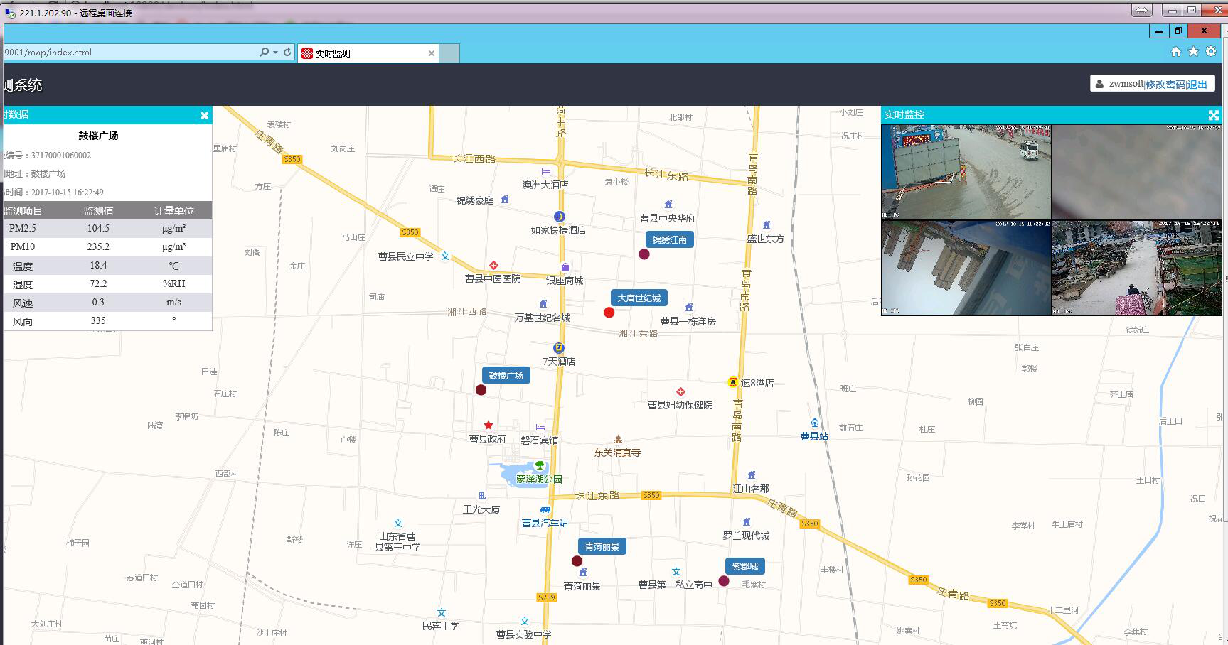 通过系统首页左侧主菜单可以查看到系统实时监测的数据信息,利用GIS地图位置呈现功能,可结合电子地图确切的知道每个设备所在位置,通过点击地图上的设备图标可查看设备所配备各项传感器采集的实时监测因子,包括颗粒物、气象参数、视频等,双击视频播放界面可以实现放大或缩小,方便用户直观查看区域内所有监测点的部署情况和环境质量状况,实现了实时,远程,自动监控颗粒物浓度以及现场视频、图像的采集功能,而且还具有视频扬尘叠加功能。
