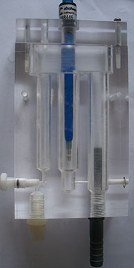 B、将电极插入恒流器的恒孔中(靠近出水口的孔座)。小心不要碰坏传感器顶端的玻璃头。安装前请务必使用生料带(螺纹处)做好防水封闭工作。在线监测被测介质应保持一定的流速且恒定,流量15-30cm