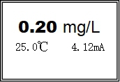 主界面中溶解臭氧值为主显示,温度值、电流值为副显示。正上方为当前溶解臭氧测量值,4.12mA为电流输出值。
