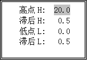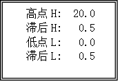 高点H:高报警设置,滞后H:高点的滞后量。低点L:低报警设置。滞后L:低点的滞后量。注: 滞后量在0~(高点H值-低点L值)范围内设置。