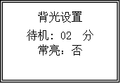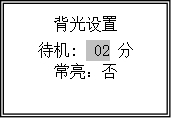 在参数设置菜单选择背光时间,按ENTER键进入背光设置菜单。按MENU菜单选择键弹出光标,移动光标,可以按上下键进行修改。按ENTER键存储数据,按ESC键返回上一级