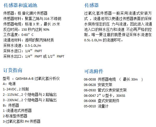 Qcontums Q45H84型过氧化氢分析仪是一款实时在线监测水中过氧化氢浓度的分析仪表。过氧化氢(H202)俗称双氧水,是一种强氧化剂,主要在造纸行业中作为漂白剂使用,也广泛用于对供水系统的消毒。此外,在污水收集系统中,用于消除硫化氢,避免硫化氢对混凝土中的水管与主体钢结悔的损坏。Q4SH84过氧化氢分析仪在水系统的应用,与在大部分的化学消毒处理过程中的应用一致,主要作用就是必须准确测量与有效控制水中过氧化氢的浓度。为了对过氧化氢投加试剂系统的精确控制,Qcontums 公司的Q45H84完全胜任水中过氧化氢 浓度的监控。过氧化氢溶液分析仪采用极谱法传感器,安装在流通池上。过氧化氢渗透腹将被测水样与电解液完美隔离,达到长期稳定监测而不 产圭污染问题。专用的渗透膜有选择性的测量过氧化物,而不受水样中的其他物质的干扰。